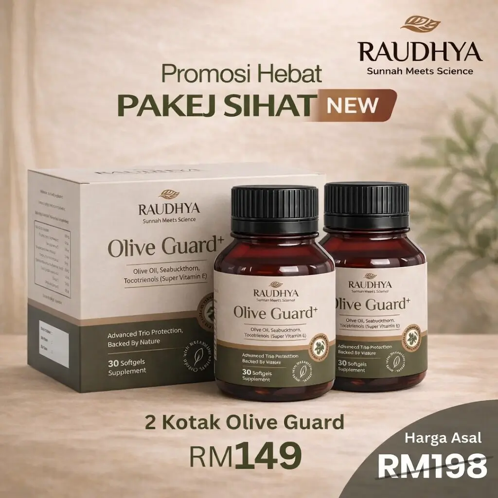 Raudhya OliveGuard+ Diperkaya Bahan Aktif Polyphenols, Tocotrienols (Super Vitamin E) & Omega Aktif Menyokong Kawalan Gula, Kolesterol & Tekanan Darah